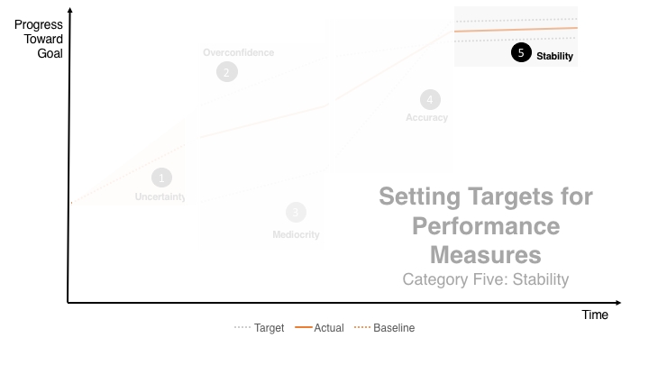 Stability occurs when performance has flatlined at an acceptable level. It occurs often with long-standing performance measures that have leveled off and show microscopic levels of improvement, if any. Targets for these measures are often 97-99% and holding. Congratulations for such a high level of achievement. It is now time to focus on a different measure.