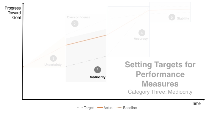 Mediocrity occurs when an organization sets targets far below its proven capacity. This most commonly occurs when individuals and programs want to appear on target or above target at all times. This practice adds very little value to any organization and should be avoided.
